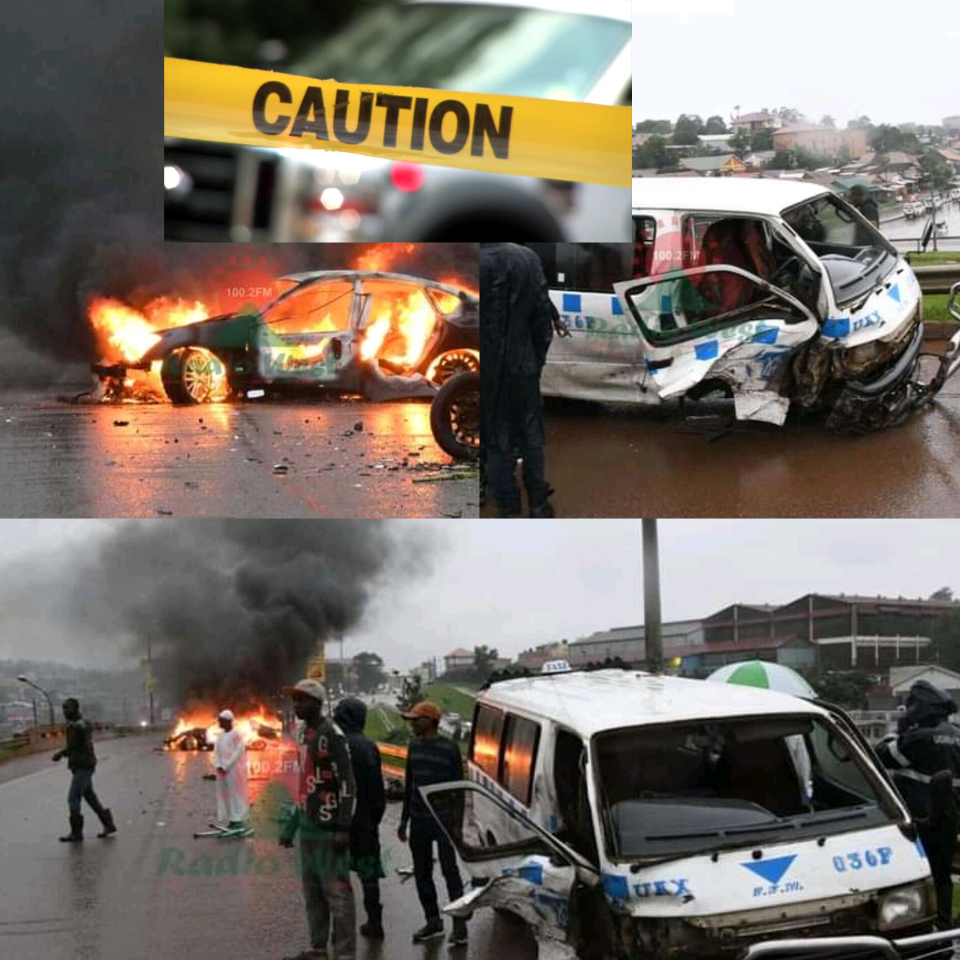 Emotoka ya Saloon Car yakwatwa omuriro bwanyima y'okutomerana n'emotoka ya taxi eya namba UAX 036F ahari Namboole Flyover omuri Kampala.